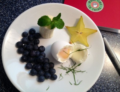 Hard-cooked egg. blueberries, banana and starfruit.