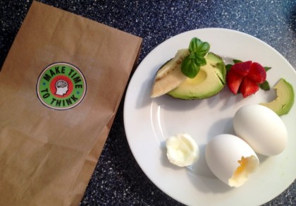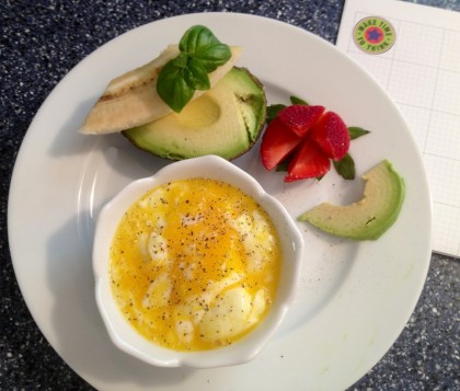 Hard-cooked egg, avocado strawberry and banana.