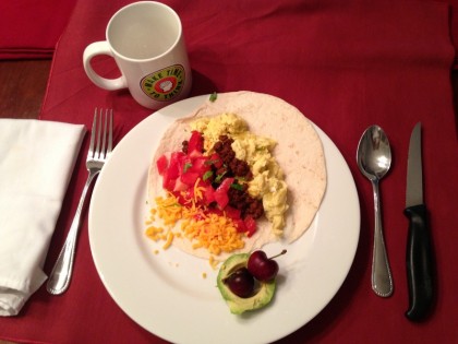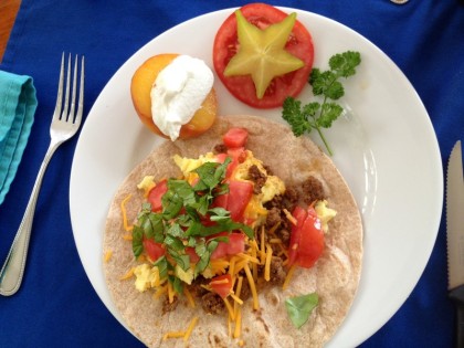 Breakfast Taco: Organic eggs, ground chuck with taco seasoning,