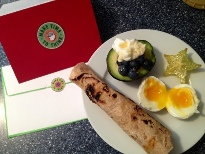 Hard-cooked egg, blueberries, starfruit, avocado,