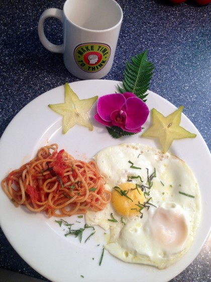 Spaghetti, eggs and starfruit.