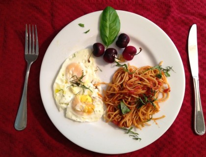 Spaghetti, eggs and cherries.