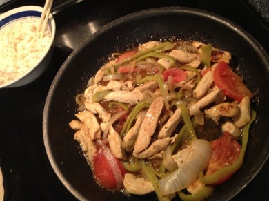 Chicken Fajitas. Chicken, tomato, green pepper and onion. Served with rice and tortilla shells.