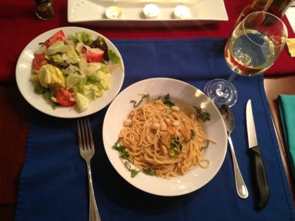 Clams and spaghetti. Served with salad and chardonnay.